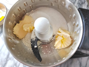 ![]() 【タルト生地作り】 1:フードプロセッサーに卵黄以外のタルト生地の材料を入れ、粉末になるまで混ぜます。 |