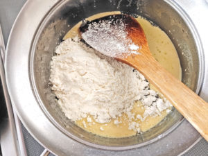 ![]() 19:沸騰して、泡が黄色から白に変わったら、火を止めます。 20:ふるった薄力粉を一気に加えて混ぜながら、粉っぽさがなくなるまで混ぜましょう。 |