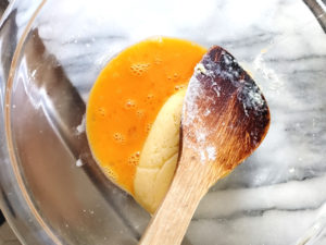 ![]() 21:他のボウルに移し、卵を溶いてから、数回に分けて加えます。 22:へらで持ち上げてみて、生地がゆっくり三角形に落ちるようになるまで卵を加えましょう。 ※卵の分量は生地によって変わります。 |