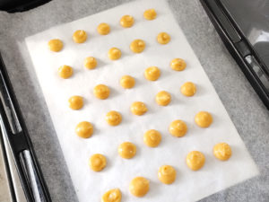 ![]() 31:カラメルができたら、クッキングシートを用意しておきます。 32:シュー生地を24個分、ひっくり返してから、カラメルを付け、そのままシートの上で冷ましましょう。 33:タルト生地の上に、冷ましたシューを、またひっくり返してカラメルを付け、それぞれ4個ずつ、シュー生地を乗せます。 ※カラメルが接着剤代わりになります。 |