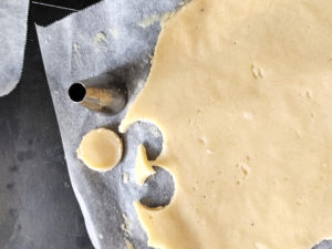 ![]() 23:冷やして置いたタルト生地をクッキングシートの上に、7cmほどの円い型で抜いたものを6個用意しましょう。 24:さらに、その上に絞り袋に入れたシュー生地(口金は10mm程)を、外周の円状に絞ります。 |