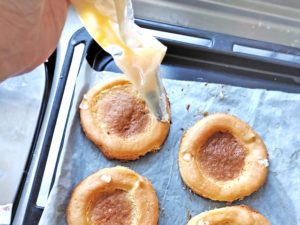 | 【オーブンで焼く】 タルト生地に絞ったシューは、170度で25分間ほど焼き、ミニサイズのシューは、温度を上げて、180度で20~25分間ほど焼きます。 ※薄茶色まで焼きますが、途中で扉を開けるのはNG。 |