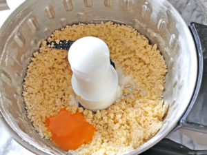 ![]() 2:フードプロセッサーにタルト生地の卵黄を入れ、再度攪拌して、まとまればOK。 |