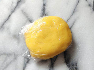 ![]() 【クッキー生地作り】 4:フードプロセッサーにクッキー生地用のマーガリン、グラニュー糖、薄力粉を入れ、まとまるまで混ぜます。 5:ラップに包み、平たい円状にしたら、冷蔵庫で1時間以上冷やしましょう。 |