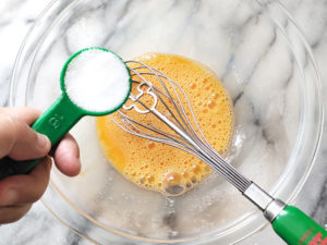 ![]() 【全卵カスタード作り】 6:耐熱ボールに、カスタード用の卵を入れ、泡立て器で筋がなくなるまで混ぜます。 7:砂糖を大1ずつ加え、その都度よく混ぜましょう。 |