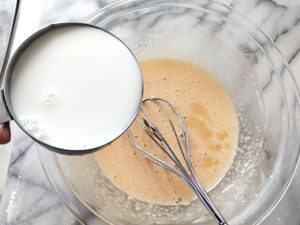 ![]() 9:牛乳を少しずつ加えながら、その都度よく混ぜましょう。 10:バニラオイルも2振りくらい混ぜます。 |