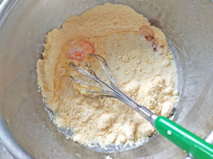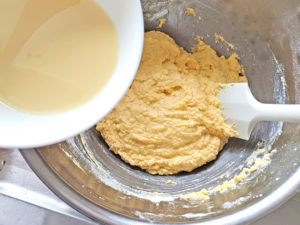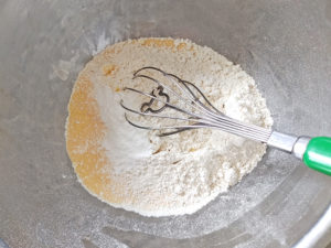 ![]() 1:コーンミール、薄力粉、ベーキングパウダーをボールに一緒にふるい入れ、良く混ぜ合わせます。 |