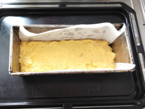 ![]() 5:パウンドケーキ型にクッキングシートを敷き、生地をすくい入れましょう。 6:表面を平らにならしたらOK。 |