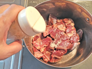 ![]() 1:大きめの鍋にマーガリンを溶かし、牛肉を弱火で炒め始めます。 2:途中、味塩コショウ(分量外)があれば、3振りほどしておくと下味が付きます。 ※塩コショウはなくても大丈夫です。 |