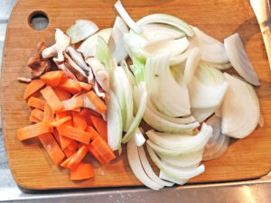 ![]() 3:玉ねぎは皮をむいて薄切りに、椎茸は石突を落として薄切りに、人参は皮をむいて薄めの長方形に切りましょう。 |