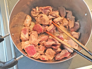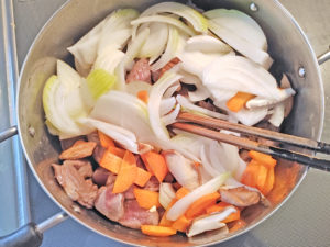 ![]() 5:肉の入った鍋に、玉ねぎ、椎茸、人参を加え、全体に油が回るまで軽く炒めます。 |