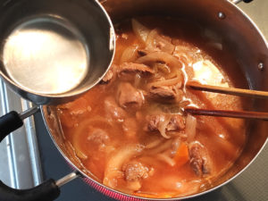 ![]() 7:水を加えて煮立たせたら、一旦火を止めて、カレールーを溶かします。 |