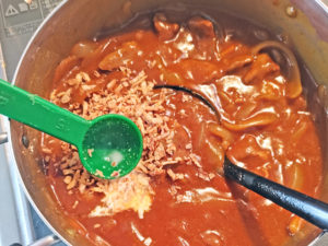 ![]() 8:ルーが完全に溶けたら、お好みでオニオンフレークも加えて、さらに弱火で2~3分煮ればOK。 ※ルーが焦げるかもしれないので、混ぜながら加熱してください。 |