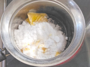 ![]() 1:レッドカラントは洗って、茎を取っておきます。 2:小鍋にマーガリンを溶かしたら、上白糖100gを加えて、弱火で溶かしましょう。 |
