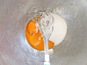 ![]() 5:別のボールに卵黄と残りの砂糖から大1分を加えて、白っぽくなるまですり混ぜます。 |