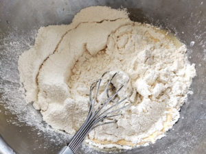![]() 7:薄力粉とベーキングパウダーを卵黄のボールにふるい入れ、泡立て器で練らないように混ぜます。 |