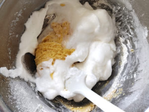 ![]() 8:メレンゲを卵黄のボールに加え、切るように混ぜましょう。 |