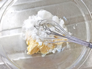 2:柔らかくなったら、砂糖も加え、砂糖のざらざら感が消えるまで、泡立て器で混ぜましょう。