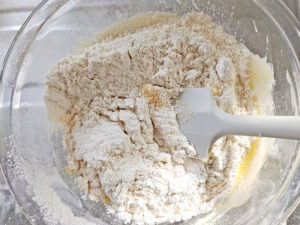 5:薄力粉とベーキングパウダーを合わせてふるい入れ、ゴムベラで練らないように混ぜます。