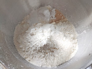 ![]() 1:スタンドミキサーのボールに、強力粉、薄力粉、砂糖、塩、ベーキングパウダー、ドライイースト(塩の反対側に)を入れて、さっと混ぜ合わせます。 |