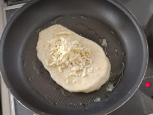 ![]() 10:テフロン加工のフライパンを弱火で熱し、手をかざして温かく感じたら、生地を焼きましょう。 11:片面3分ほど焼き、ひっくり返したら、チーズを1/8量ずつ乗せて焼きます。 12:チーズが溶けたら、OK。 |