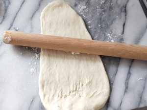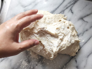 ![]() 5:台の上に、強力粉で軽く打ち粉(分量外)をし、表面が滑らかになるまで捏ねましょう。 |