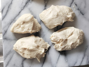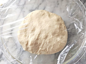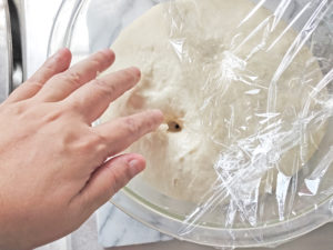 ![]() 6:別のボールに丸めた生地を入れ、ラップをして、35度のオーブンで30~45分置きます。 ※一次発酵 |
