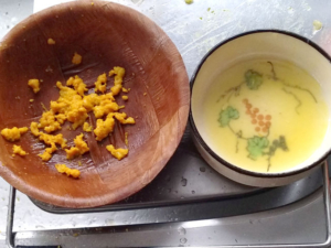③無塩マーガリンを耐熱ボールに入れ、レンジで2分程加熱して、完全に溶かしたら、卵黄のボールに少しずつ注ぎ入れ、その都度良く混ぜます。