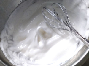①卵白のボールに砂糖をひとつまみ加えて泡立て始め、クリーム状の硬さになったら、二回に分けて砂糖を加えて泡立て、角がゆれるくらいの柔らかいメレンゲを作ります。