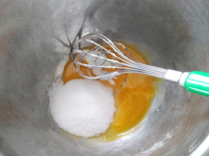 ②卵黄のボールに卵黄用の砂糖の全量を加え、白っぽくもったりとして、少し跡がつくまでしっかりと泡立てましょう。