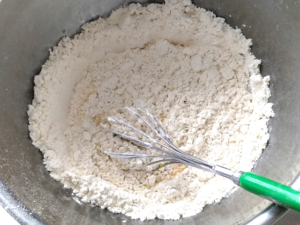 ⑤卵黄のボールに薄力粉をふるい入れ、粉っぽさがなくなるまで混ぜます。