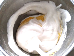 ⑥メレンゲを全量加え、ゴムベラに持ち替えて、生地のブツブツが消えるくらいまでさっくりと混ぜます。