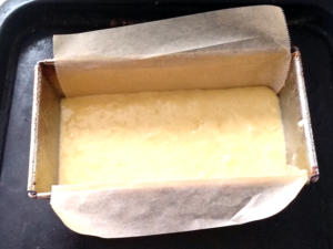⑦パウンドケーキ型にオーブンシートを敷き、生地を流し入れます。