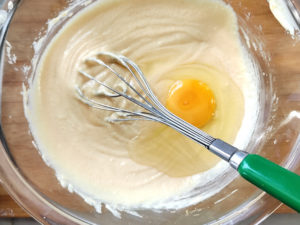 ![]() 5:耐熱ボールに卵を1個ずつ加え、その都度よく混ぜましょう。 |