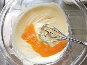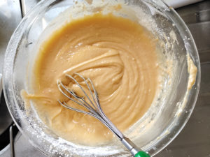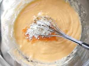 ![]() 5:最後の卵を入れる前に、2回に分けて、分量の薄力粉から大1ずつ取り、生地に混ぜておきます。 |