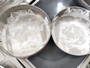 ![]() 6:同じサイズのケーキ型を2個用意し、それぞれクッキングシートを溶かしたマーガリン(分量外)などを塗って貼り付けましょう。 |