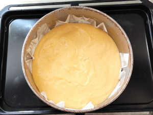 | 【オーブンで焼く】 180度のオーブンで、20~25分ずつ焼きます。 ※コンベクションオーブンは、最初の15分を180度、残りの時間は170度くらいが目安。 すぐにケーキ型から外し、完全に冷めるまで置きましょう。 |