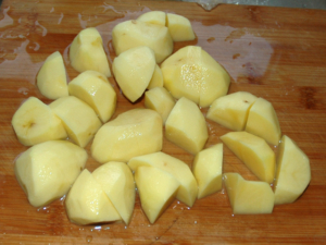 ![]() ①じゃがいもは皮をむき、小さめの一口大に切ります。 |