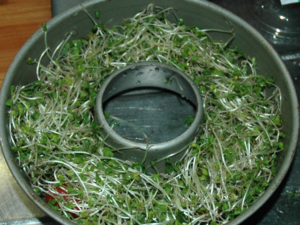 ![]() ④トマトの上から、ブロッコリースプラウトを全体に均一に広げます。 |