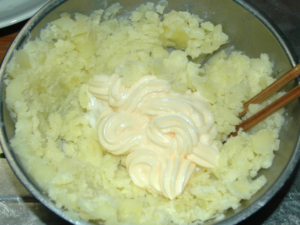 ![]() ⑥フレンチドレッシングとマヨネーズを加えて混ぜ、ポテトサラダの完成です。 |
