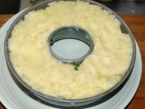 じゃがいもはしっかりとゆでて、柔らかくすると、ケーキ型に入れやすくなります。