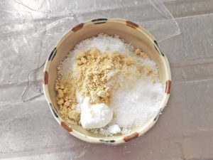 ![]() 1:小さめの器に、塩、上白糖、粉からしを入れ、軽く混ぜ合わせておきます。 ※早く漬けたい場合は塩は大2、時間をかけて減塩にしたければ塩は大1です。 |