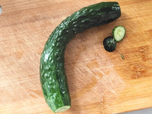 ![]() 3:きゅうりは両端を落とし、長いようなら、半分にカットします。 |