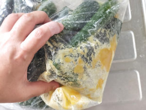 ![]() 4:ZIPロックにきゅうりを入れ、袋の上から、全体になじむまで、良く混ぜ合わせましょう。 |