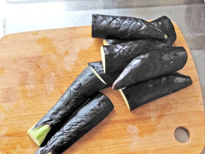 ![]() 1:茄子はヘタを落とし、半分にカットしてから、浅く格子状に切れ目を入れます。 |