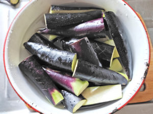 茄子は水に漬けておくと、油を大量に吸わなくなり、アクも抜けます。