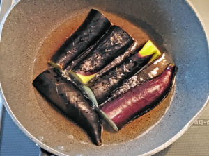 ![]() 3:フライパンに高さ1cmほどのサラダ油(分量外)を引き、ナスが箸でつまむとくたっとするまで、裏返しながら焼きます。 |