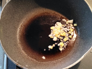 ![]() 4:茄子をフライパンから取り出し、軽く拭いたら、サラダ油大1(分量外)を引き、生姜とにんにくを炒めましょう。 5:弱火で炒め、香りが出たらOK。 |