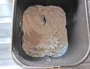 ![]() 2:シロカのHBにまず、290gの粉を入れ、水を右半分に入れて、水が直接くっつかないように、離してドライイーストを置きます。 |