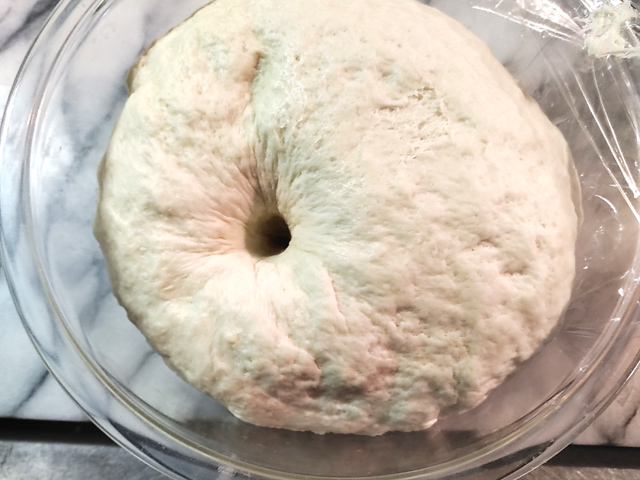 13:膨らんだ生地に指をさしてみて、穴が戻らないようなら一次発酵完了。